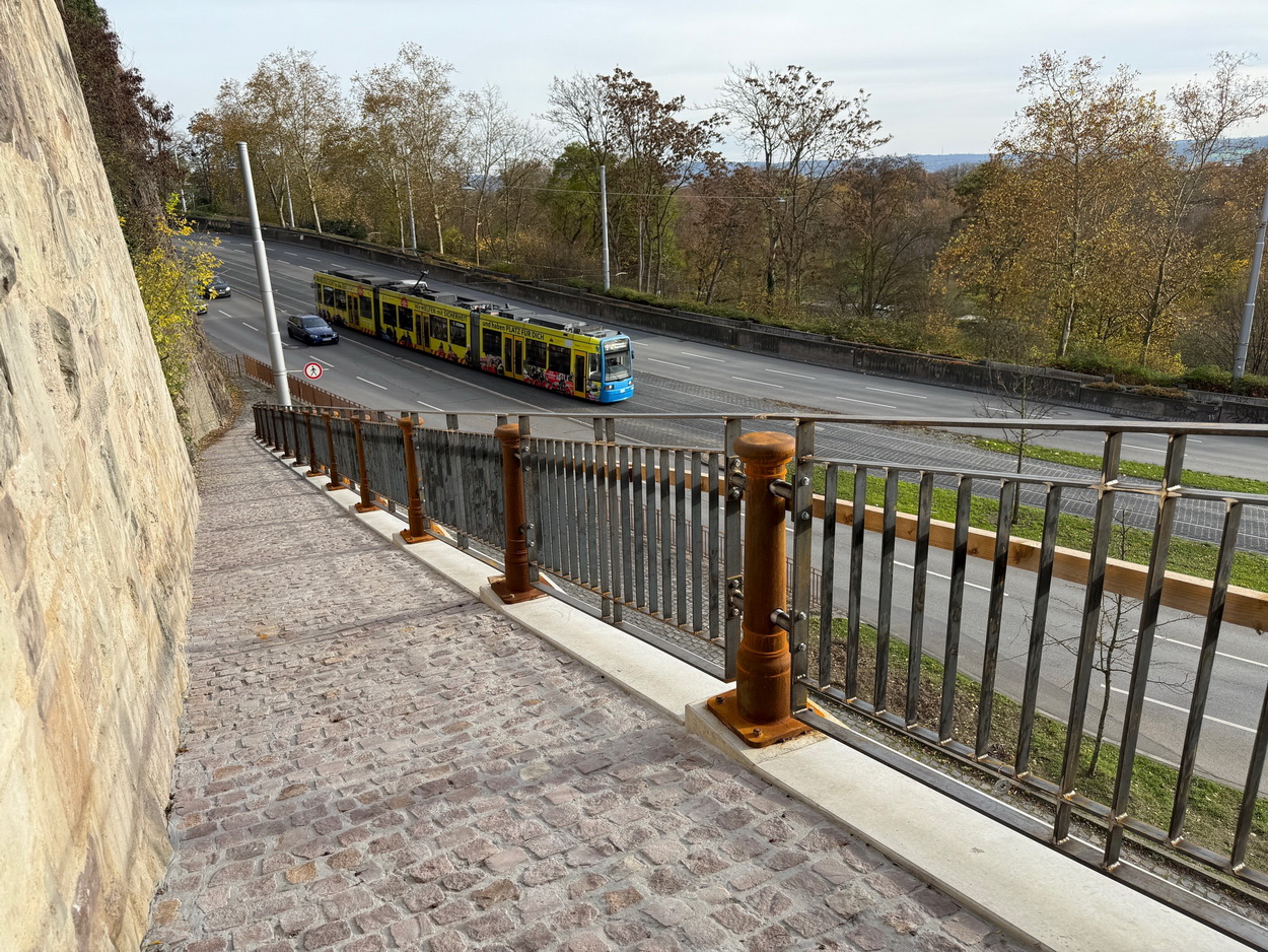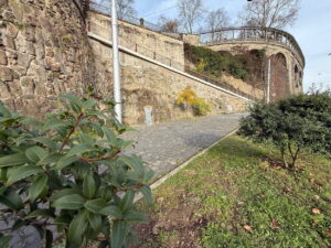 Nach etwa sechsmonatiger Bauzeit sind die Arbeiten an der Rampe am Weinberg nun abgeschlossen. Wenn der Weinberg nach der Winterpause für Besucher am 1. April 2026 wieder geöffnet wird, ist es erstmals wieder möglich, von der Frankfurter Straße stufenlos zur zentral gelegenen Gewächshausruine zu gelangen.