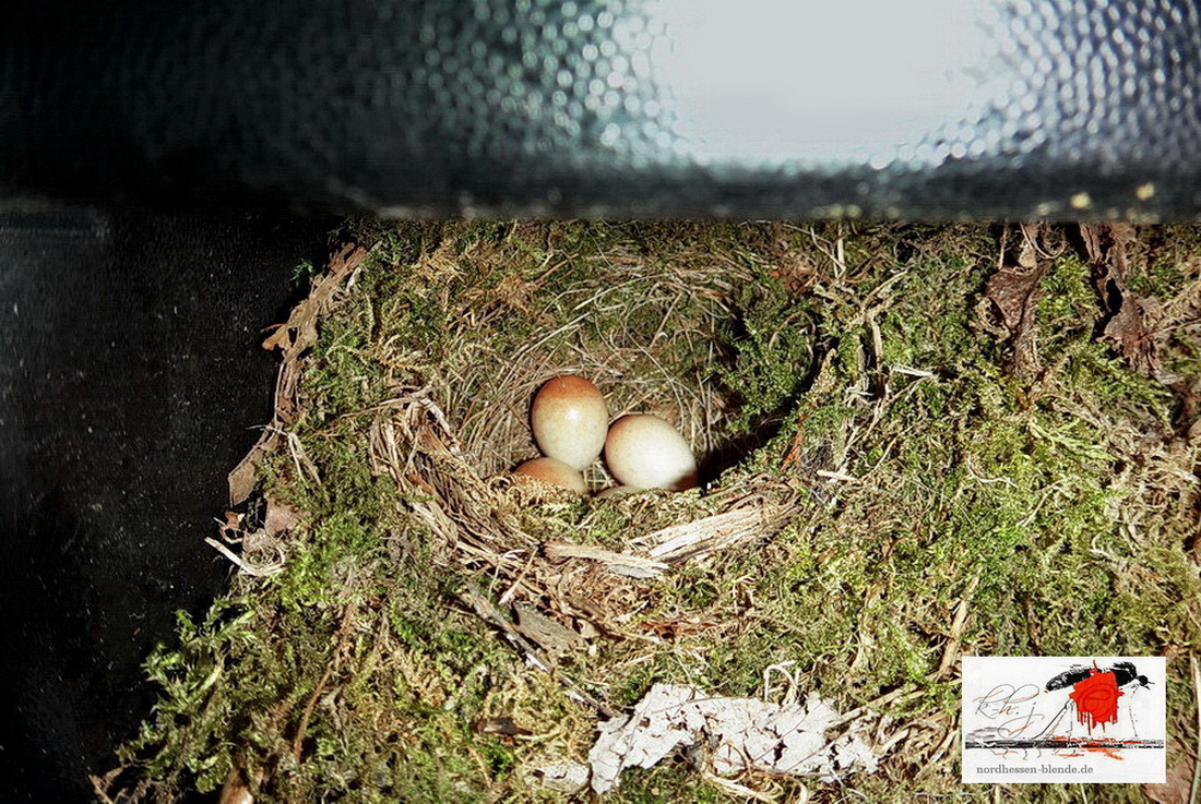 Ein Rotkehlchen Paar hatte sich ausgerechnet unser Campingmobil als Brutplatz ausgewählt, diesem wurde mit sofortiger Wirkung Ausfahrtverbot erteilt bis die kleinen Rotkehlchen flügge waren. Das Gelege umfasste vier gelbliche Eier mit zahlreichen rotbraunen Punkten und Linien. NHB.KAJO.