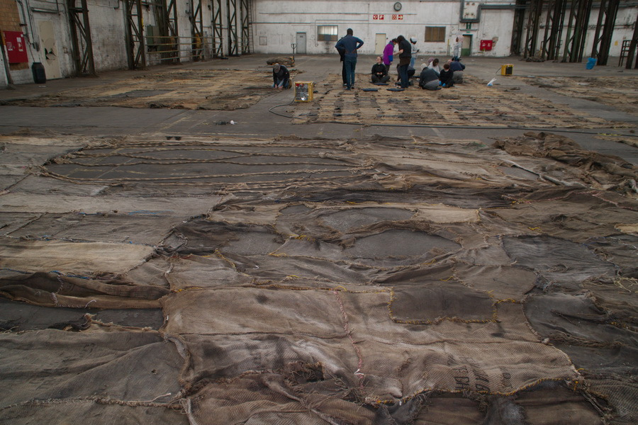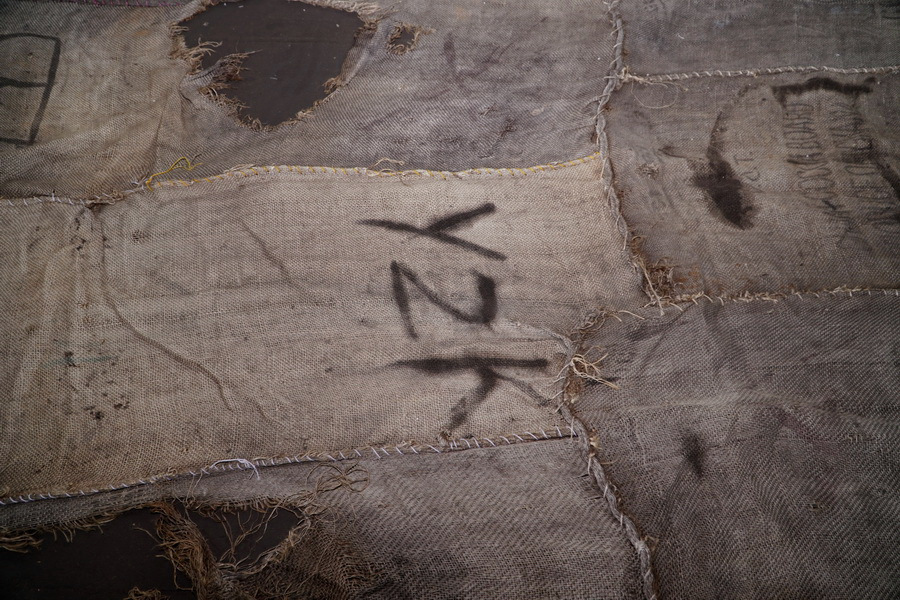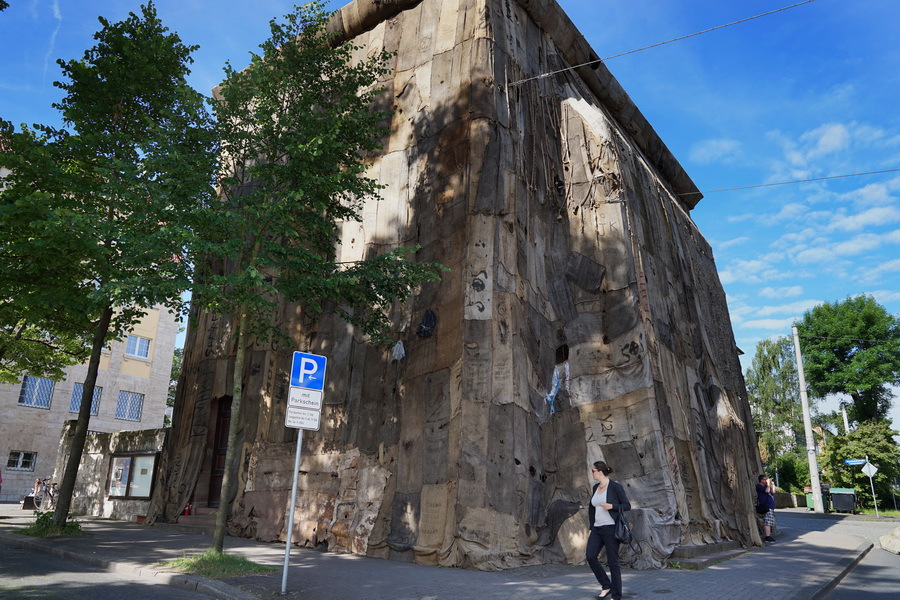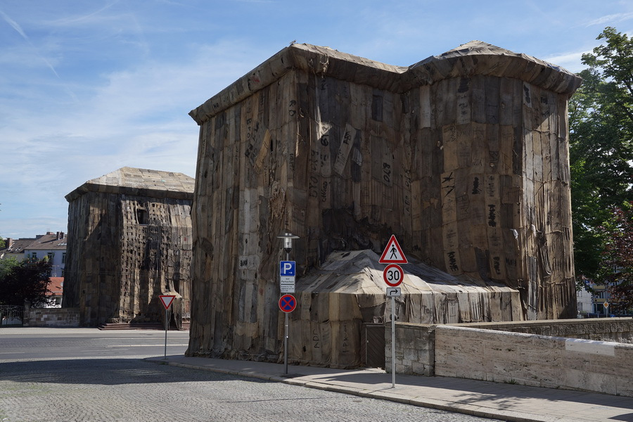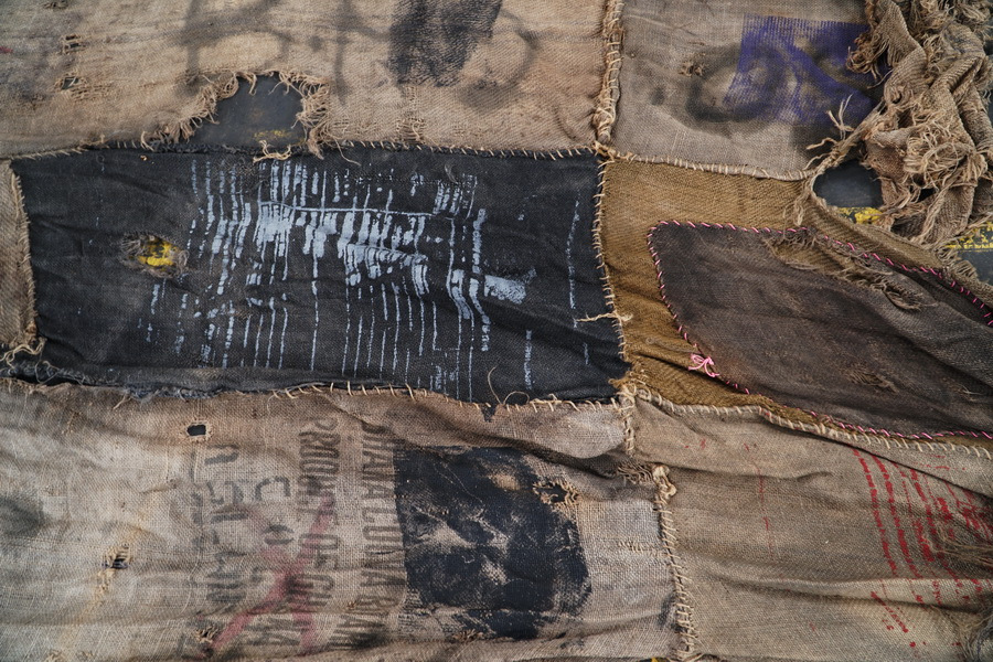DieTorwache wurde komplett verkleidet und mit Jutesäcken umhüllt.Ibrahim Mahama, der 1987 in Tamale, Ghana, geboren, ist ein Shootingstar der internationalen Kunstszene