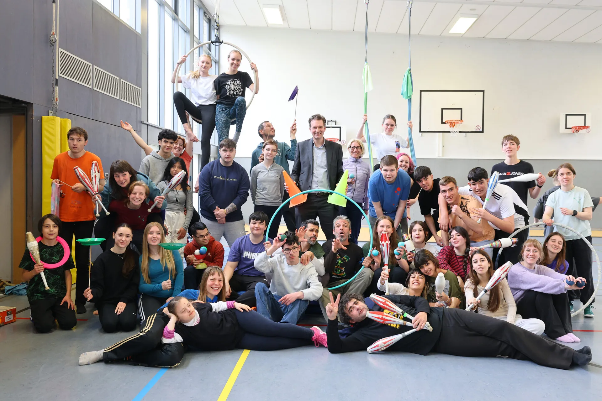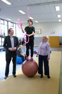 Schon am zweiten Tag durften die Jugendlichen aus Spanien und Deutschland gemeinsam Zirkusluft schnuppern „Es war wirklich beeindruckend zu sehen, wie die jungen Menschen mit Freude und großem Geschick das Trapez ausprobiert, jongliert und sich akrobatisch betätigt haben“, zeigt sich Oberbürgermeister Sven Schoeller beeindruckt. „Die Behinderung mancher Teilnehmenden war den Jugendlichen völlig egal. Im Mittelpunkt stand das Miteinander, das miteinander lernen, gemeinsam aktiv sein und Unterschiede nicht als Hindernis, sondern als Bereicherung zu erleben. Daher ist für mich dieser Workshop auch Vorbild für unsere Gesellschaft.“ Als Schirmherr hat Schoeller den Workshop besucht und bei den Zirkusübungen selbst mitgewirkt.